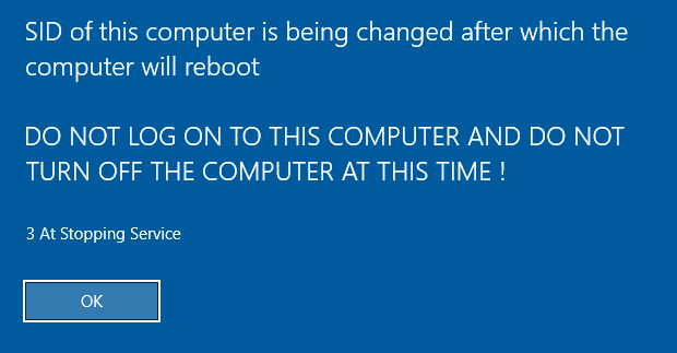 After completing the SID change, the system will automatically shut down or reboot. Do not do that yourself, do not log in, and do not interfere. Best is to not touch the PC at all before the automatic shutdown/reboot !